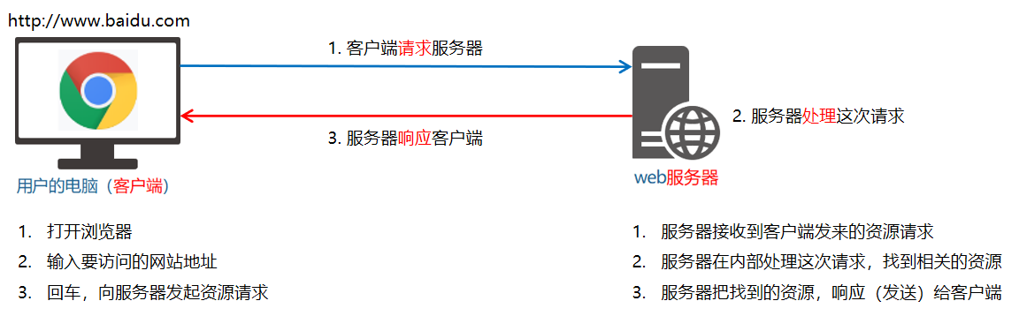 - 客户端与服务器之间的通信过程,分为 请求 – 处理 – 响应 三个步骤。