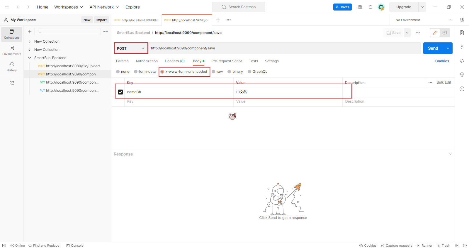 PostMan界面的组成部分,从上到下,从左到右,分别是:
